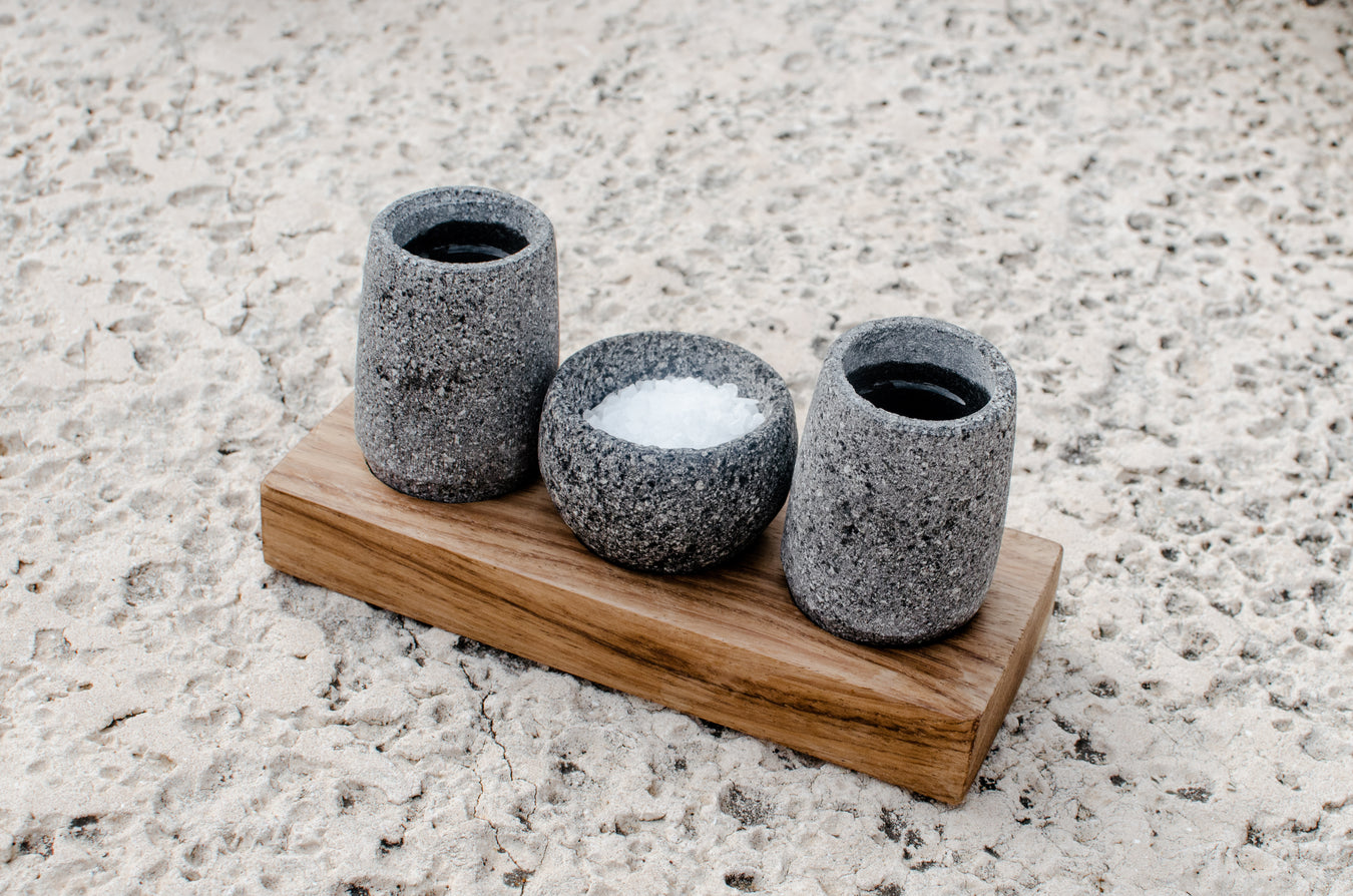 Juego de 2 Caballitos tequileros de 2oz (59ml) Para Bebida y un recipiente para Sal y/o Limón de Piedra Volcánica Con Base de Madera Parota, Hecho en Mexico